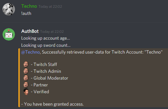 The bot was used to provide server roles to the user based on their account moderator status and Twitch ranks.