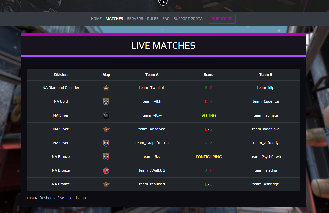 Over the period of three days before the release of the league I created this website to showcase the highlights of Mythic League and create a central location where users would be able to view the currently live matches and our available community servers.