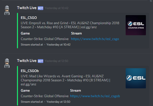Twitch Live is a Discord bot that utilizes the Twitch API to receive updates on a channel’s stream state, then post messages to Discord to alert moderators.